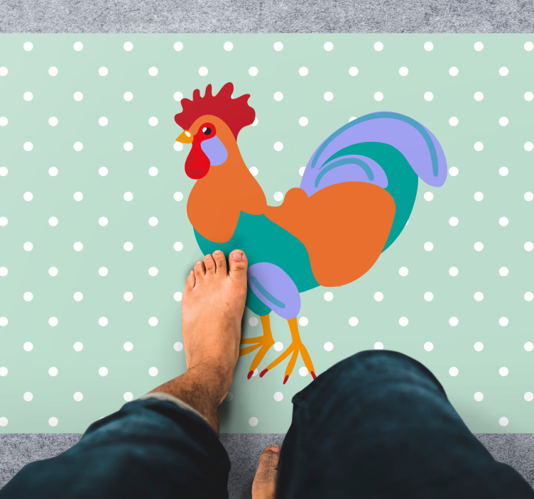 Descubre la aflombra vinílica animales arte del gallo vibrante, una pieza única que ilumina cualquier espacio con su diseño alegre y colorido. Esta alfombra presenta un gallo caricaturesco rodeado de un patrón de fondo lleno de topos y lunares, creando un ambiente juguetón y vibrante que encantará a grandes y pequeños. ¡Es el complemento perfecto para dar vida a tu hogar!