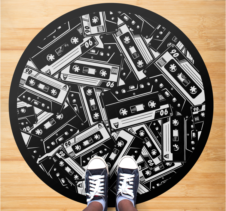 Referencia: R19711Una disposición creativa de cintas de casete llena la superficie circular, presentando una paleta monocromática de blanco y negro. El diseño destaca varios ángulos y posiciones de las cintas, ofreciendo un guiño nostálgico a la historia de la música y la estética retro.