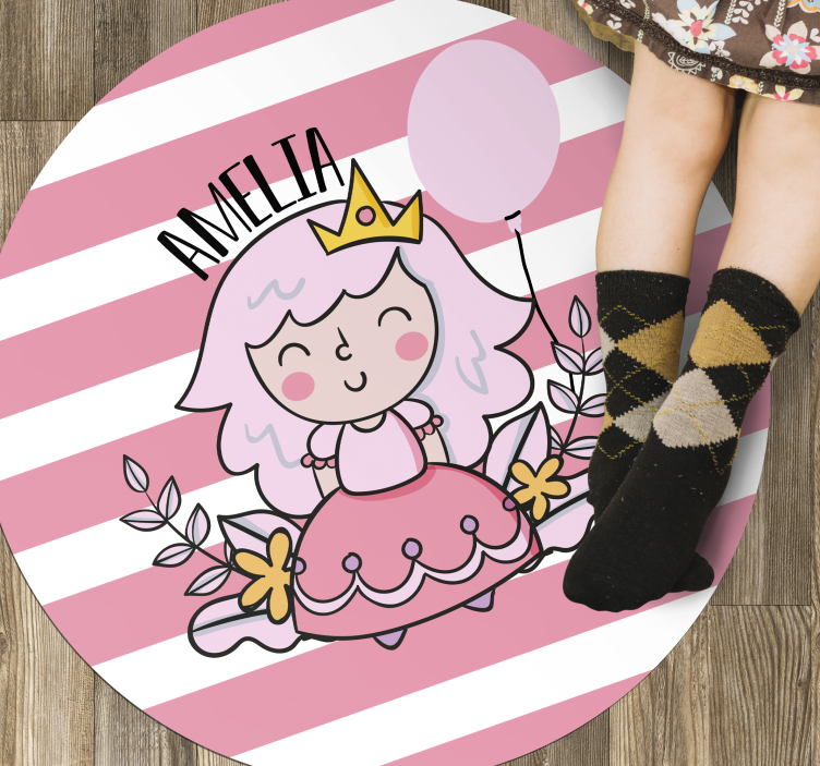 Si buscas un artículo para redecorar la habitación de tus hijos, nuestra alfombra personalizada Princesa de hadas rosa con globos es una excelente opción. Con forma circular y una franja de color blanco y rosa, este diseño de princesa se puede personalizar con el nombre de tus hijos.