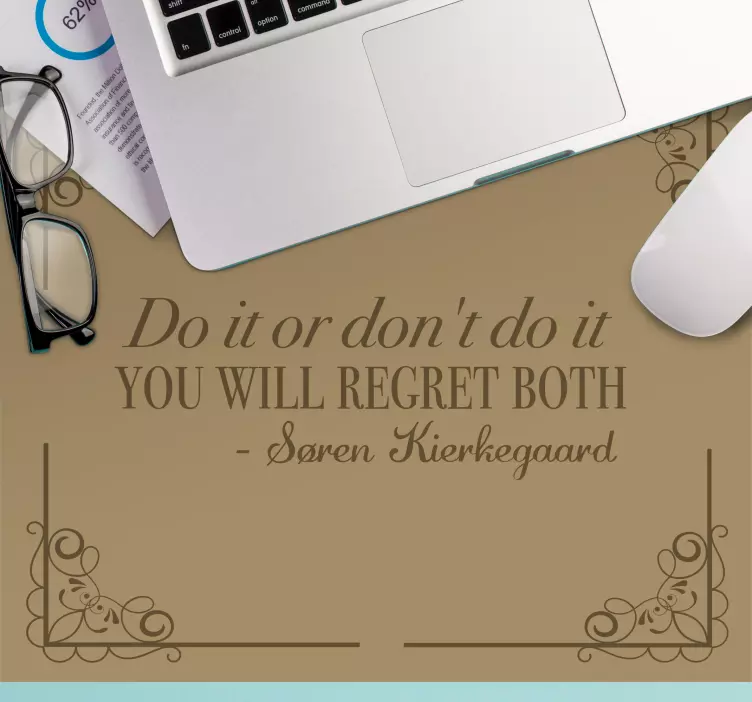 Referencia: N4261El diseño presenta una poderosa cita de Søren Kierkegaard que enfatiza la inevitabilidad del arrepentimiento, ya sea que uno actúe o no. La elegante presentación tipográfica está enmarcada por elementos decorativos, convirtiéndola en una pieza inspiradora.