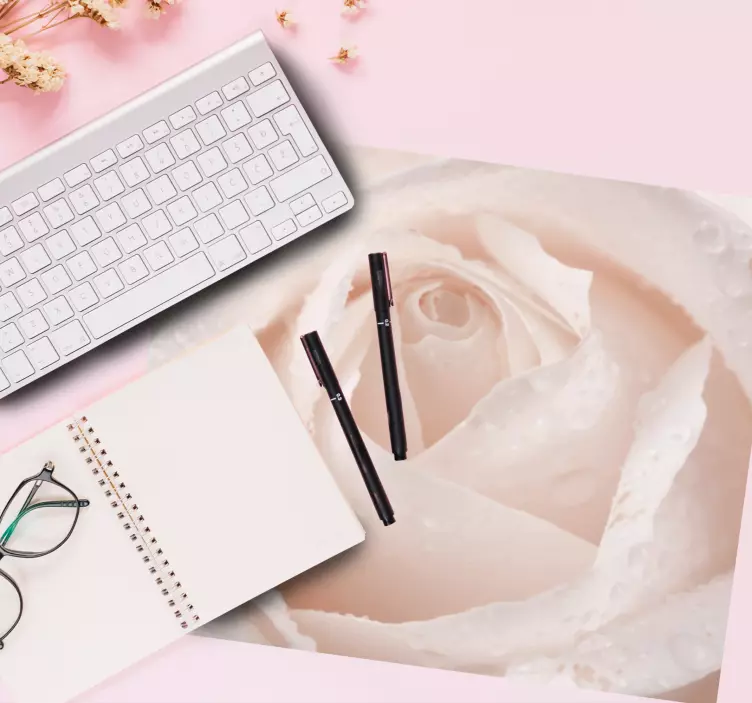 Descubre la belleza de la naturaleza con nuestro Mouse pad original primer plano floral delicado. Este diseño cautivador presenta un primer plano de pétalos de rosa en tonos blancos y sutiles, donde las gotas de agua brillan como joyas sobre su superficie. La elegancia de esta fotografía transforma su espacio, aportando una suave textura que invita a la calma y la inspiración. ¡Un verdadero deleite visual para cualquier amante de la naturaleza!