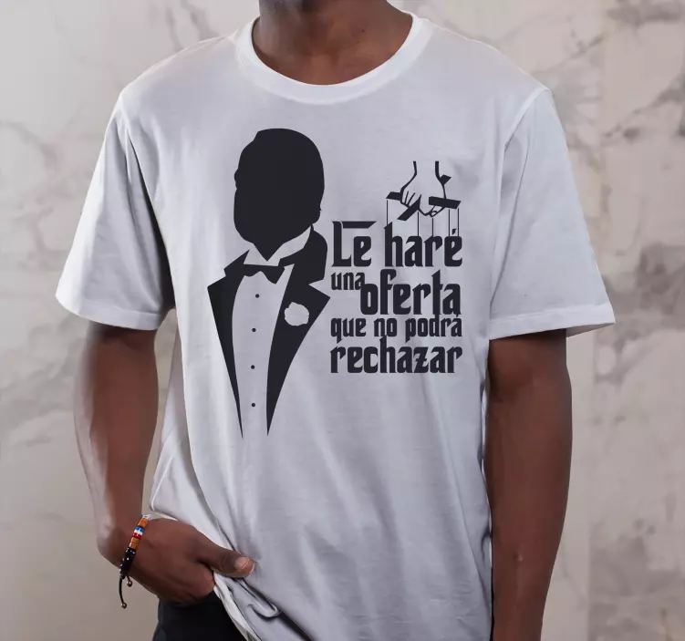 Esta camiseta es cómoda y cuenta con la silueta del Padrino y su icónica cita. Puedes elegir entre una variedad de tamaños que ofrecemos para que puedas disfrutar de una apariencia única. Ya sea para ti o como regalo para alguien especial, esta camiseta seguramente se verá genial.