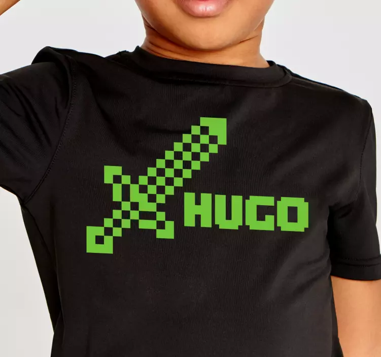 Referencia: T4921Esta pieza vibrante presenta un diseño de espada pixelada junto a un nombre personalizable. El audaz verde contra un fondo negro elegante crea un atractivo visual impactante, perfecto para los jóvenes entusiastas de los videojuegos. Es una adición divertida y personalizada a cualquier guardarropa infantil.