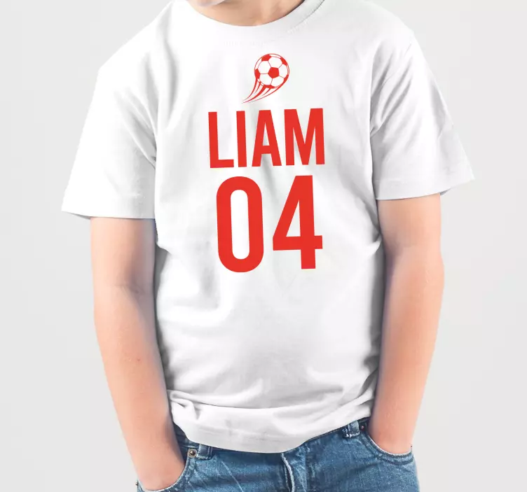 Referencia: T4113Este diseño presenta un vibrante tema de fútbol, mostrando el nombre 'Liam' junto al número '04'. Los colores son llamativos, con intensos rojos contrastando contra un fondo blanco, perfecto para los jóvenes entusiastas del fútbol.
