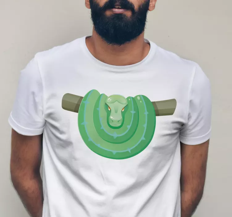 Descubre la remera diseño verde serpenteante, una pieza única que combina un elegante diseño gráfico con una ilustración de una boa que se enreda entre ramas, todo con un estilo de dibujos animados. Este diseño en tonos verdes no solo es casual, sino también una expresión de originalidad que te hará destacar en cualquier ocasión.