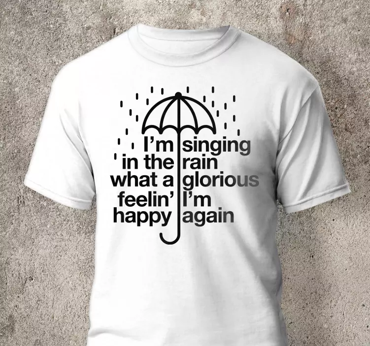 Referencia: T4934Este diseño presenta un paraguas alegre rodeado de gotas de lluvia, complementado por un texto inspirador. Captura un espíritu alegre, fomentando la positividad incluso en días nublados. La tipografía estilizada añade un toque juguetón, haciéndolo perfecto para cualquiera que quiera expresar su amor por la vida y la música.