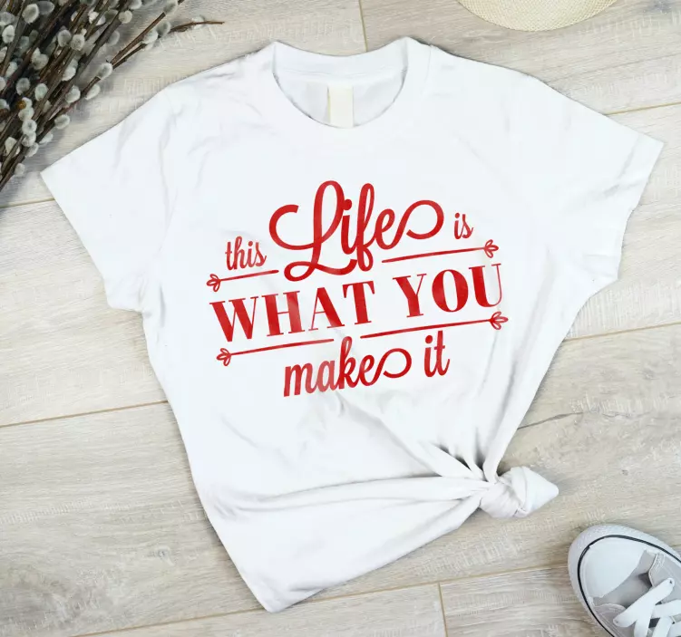 Referencia: T4937Este diseño presenta una fuerte cita motivacional que enfatiza el tema de que la vida es lo que tú haces de ella. Las letras en negrita y los colores vibrantes capturan la atención, lo que lo convierte en una excelente opción para ropa casual que inspire positividad.