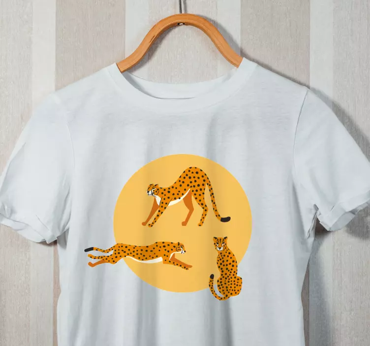 Referencia: T4493Esta pieza de moda presenta un encantador trío de guepardos animados en poses juguetonas, enmarcados por un vibrante círculo naranja. El diseño alegre atrae a los niños, convirtiéndolo en una opción encantadora para los jóvenes amantes de los animales. Ideal para salidas casuales o aventuras divertidas.