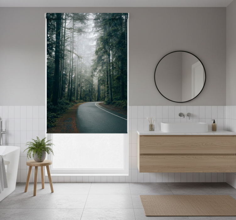 Cortina roller árboles camino de pinos nebulosos