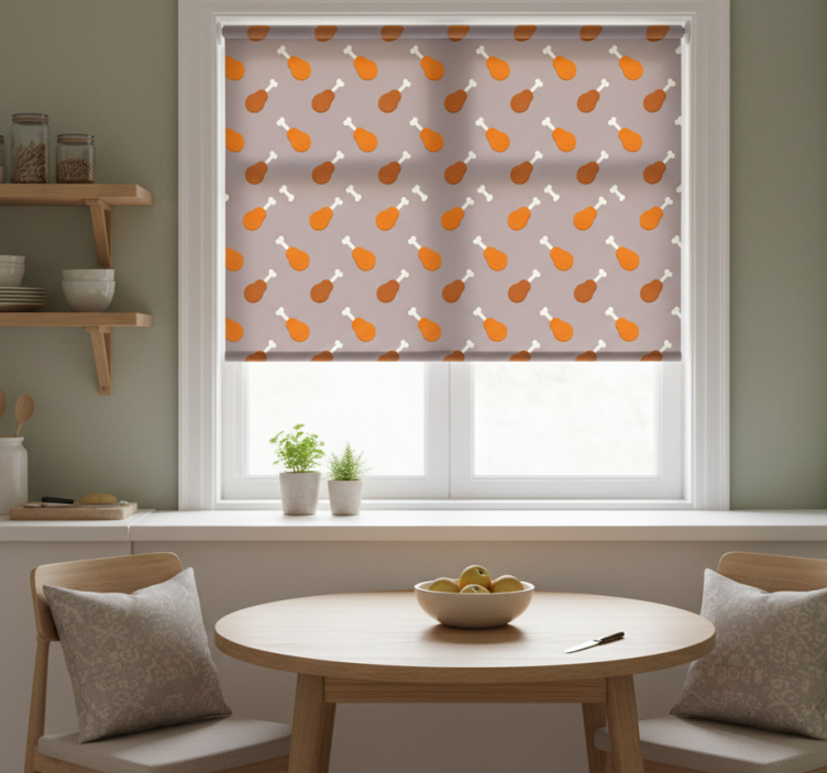 Referencia: E6434La Cortina roller cocina muslo de pollo es una pieza única que transformará tu espacio. Con un diseño divertido y atractivo, presenta un estampado que evocará la frescura y el sabor de la cocina, incorporando elementos que recordarán a la suculenta carne de pollo. Su estilo moderno y vibrante hará que tu cocina luzca acogedora y llena de personalidad.