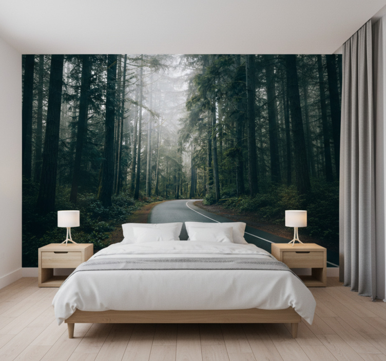 Mural de bosque camino del pino nebuloso