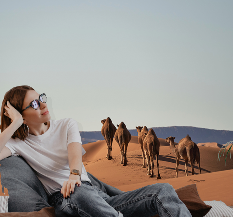 Transforma tu espacio con el impresionante Mural de desierto camellos del desierto, un diseño que captura la esencia del desierto con camellos majestuosamente paseando sobre dunas doradas y arena suave. Este cautivador paisaje te conecta con la naturaleza, creando una atmósfera única que evoca tranquilidad y aventura.
