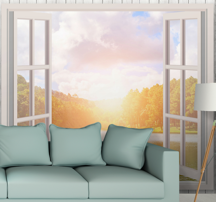 Descubre el impresionante Mural de naturaleza amanecer sobre el lago, un diseño que evoca la serenidad y la belleza del amanecer en un lago rodeado de un frondoso bosque. Con una ventana que enmarca una vista panorámica de un paisaje idílico, este trampantojo transforma cualquier espacio en un refugio natural. Los árboles se alzan majestuosamente mientras la luz del sol ilumina el agua, creando una atmósfera de paz y conexión con la naturaleza.