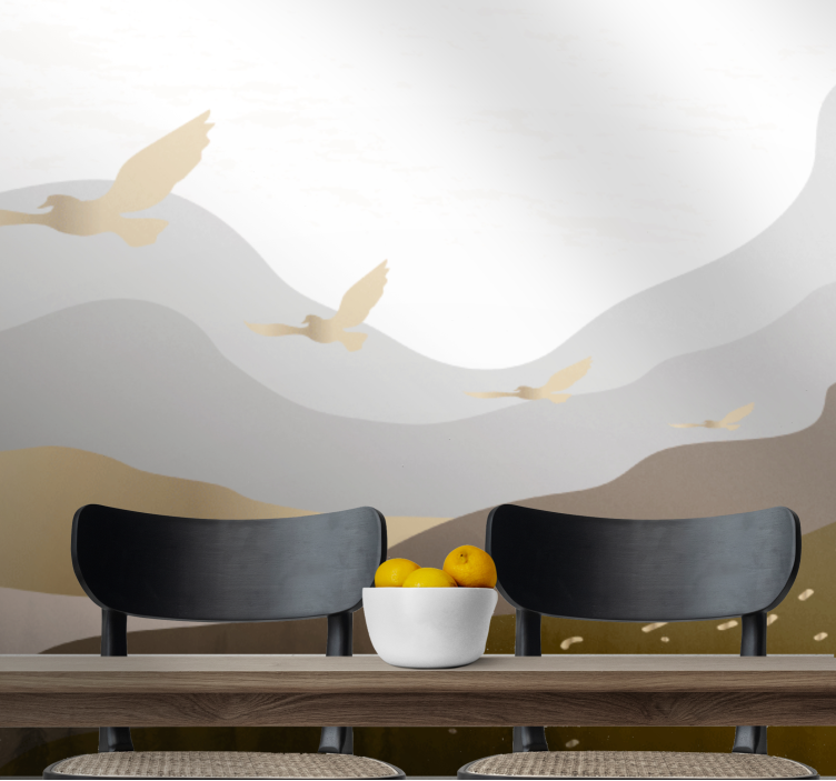 Descubre un mundo de serenidad y belleza natural con nuestro Mural de naturaleza siluetas de aves volando. Este impresionante diseño presenta silhuetas de aves en pleno vuelo, enmarcadas por majestuosas montañas, todo en un elegante tono dorado. La ilustración captura la esencia de la naturaleza, brindando un aire de tranquilidad y armonía a cualquier espacio.
