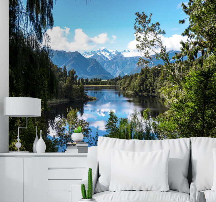 Sumérgete en la belleza natural con nuestro Mural de paisajes perspectiva de arroyo montañés. Este impresionante diseño captura la esencia de un lago sereno rodeado de majestuosas montañas, un río que serpentea a través de un bosque exuberante y un cielo azul que invita a la contemplación. Con cada detalle cuidadosamente elaborado, este mural transforma cualquier espacio en un refugio de tranquilidad y armonía con la naturaleza.