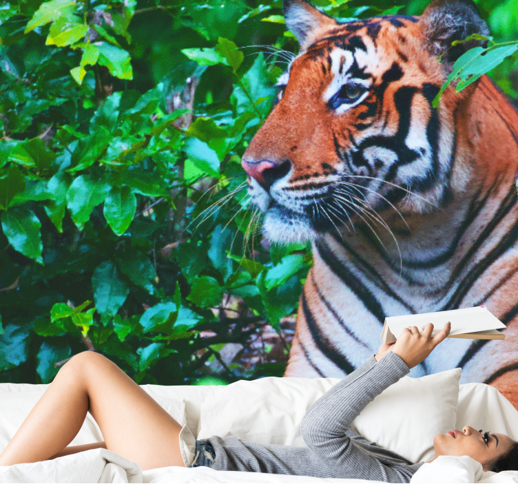 Transforma tu espacio con el impresionante Mural de selva tigre majestuoso mirando, donde la belleza del bosque se combina con las vibrantes hojas y la majestuosidad del Tigre. Esta imagen captura la esencia de la naturaleza y la fauna silvestre, brindando un toque exótico y fascinante a cualquier habitación. ¡Déjate envolver por la magia de la selva!