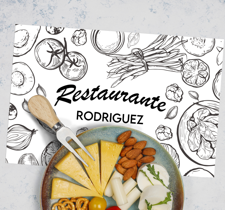 Este mantel individual para restaurante es perfecto para darle un toque personalizado a la mesa. El diseño presenta dibujos de frutas y verduras sobre un fondo blanco, y puedes personalizarlo con el texto que desees. Este mantel individual es ideal para restaurantes, pero también se puede usar en el hogar.