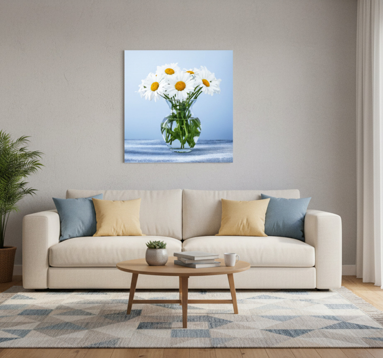 El Poster salón flores margaritas en macetas de cristal no es solo una pieza decorativa, es una invitación a disfrutar de la belleza de la naturaleza desde la comodidad de tu hogar. Este poster aporta un aire fresco y alegre que puede revitalizar cualquier habitación. Al colgarlo en tu salón, crearás un ambiente acogedor y lleno de energía positiva, perfecto para relajarse o recibir a amigos y familiares. ¡Deja que cada margarita ilumine tu espacio con su encanto!