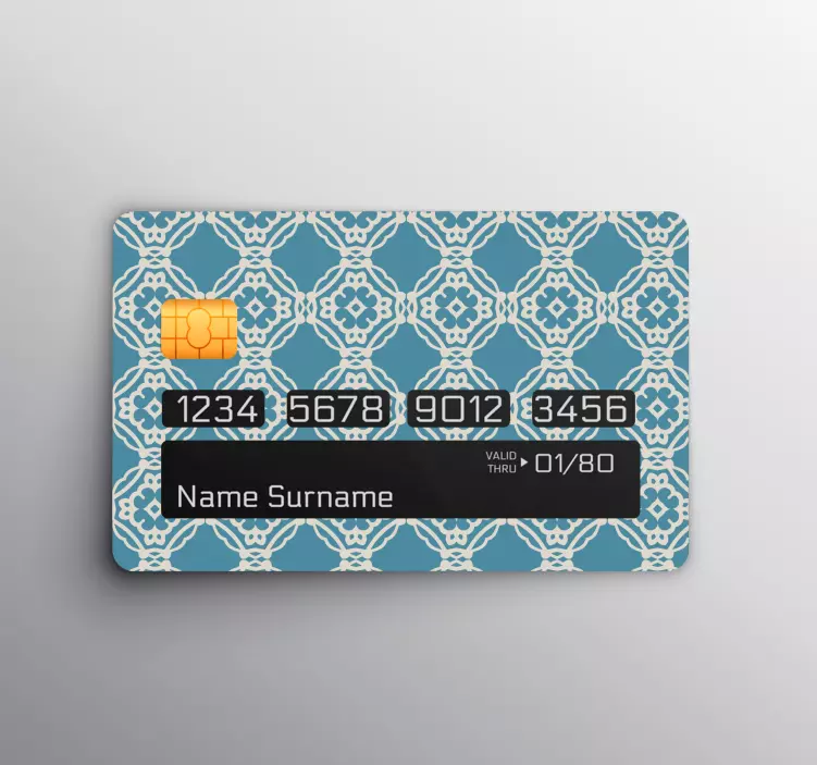 Transforma tu tarjeta de crédito con nuestro Sticker para tarjeta de crédito con diseño que presenta un hermoso diseño gráfico inspirado en los azulejos antiguos. Con un patrón geométrico en tonos azules y una textura ornamental, este adhesivo es perfecto para quienes desean añadir un toque personal y elegante a su tarjeta. Su estilo único resalta la estética de tus finanzas, haciéndolo ideal para quienes valoran la originalidad y la personalización.