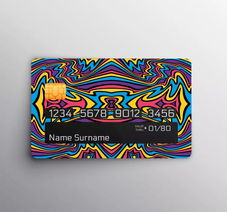 Descubre el Sticker para tarjeta elemento abstracto vivo, un adhesivo que transforma tu tarjeta de crédito en una auténtica obra de arte. Su diseño psicodélico y multicolor destaca por sus remolinos vibrantes y un patrón abstracto que atrae todas las miradas. Con un estampado vistoso, este vinilo es perfecto para quienes desean añadir un toque personal y creativo a su tarjeta.
