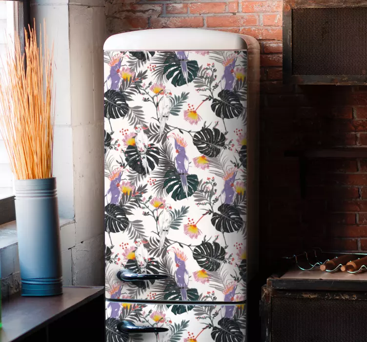 Transforma cualquier espacio con nuestro Vinilo animal de granja estampado floral tropical, un diseño vibrante que cautiva a simple vista. Este hermoso vinilo presenta un patrón lleno de vida con hojas tropicales y loros, decorando tu refrigerador, nevera, frigorífico o heladera con un toque de naturaleza. Las cacatúas y el verdor del estampado crean una atmósfera fresca y acogedora, perfecta para aquellos que aman el estilo tropical y floral. ¡Deja que la naturaleza entre a tu hogar!
