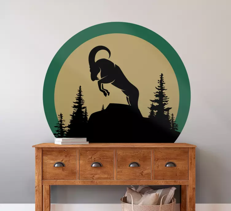 Referencia: A48507Una silueta impactante de una cabra montés capturada en pleno salto, rodeada de árboles imponentes y situada contra un fondo circular de colores suaves. Este diseño evoca un sentido de aventura y la esencia de la vida salvaje, perfecto para aquellos inspirados por la naturaleza y el aire libre.