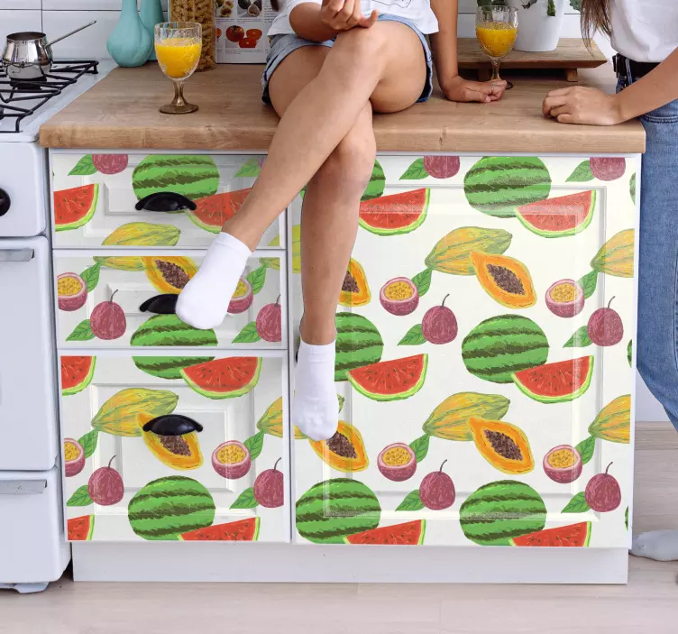 Descubre el vibrante vinilo de fruta creación de motivos frutales, un diseño lleno de vida que combina sandías, papayas y limones en un patrón tropical y vistoso. Este estampado es ideal para transformar tus muebles y darles un toque fresco y alegre, perfecto para cualquier espacio que necesite un poco de energía frutal.