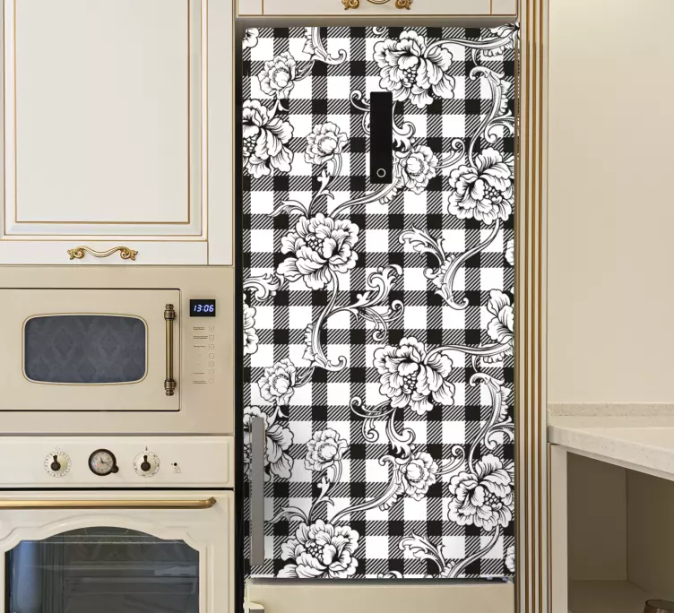 Descubre el encanto de nuestro vinilo floral patrón a cuadros floral, un diseño que combina la elegancia de lo floral con la modernidad de los cuadros. Este estampado en blanco y negro es ideal para darle un toque distintivo a tu refrigerador, nevera, frigorífico o heladera, transformando cualquier espacio en un lugar acogedor y lleno de estilo.