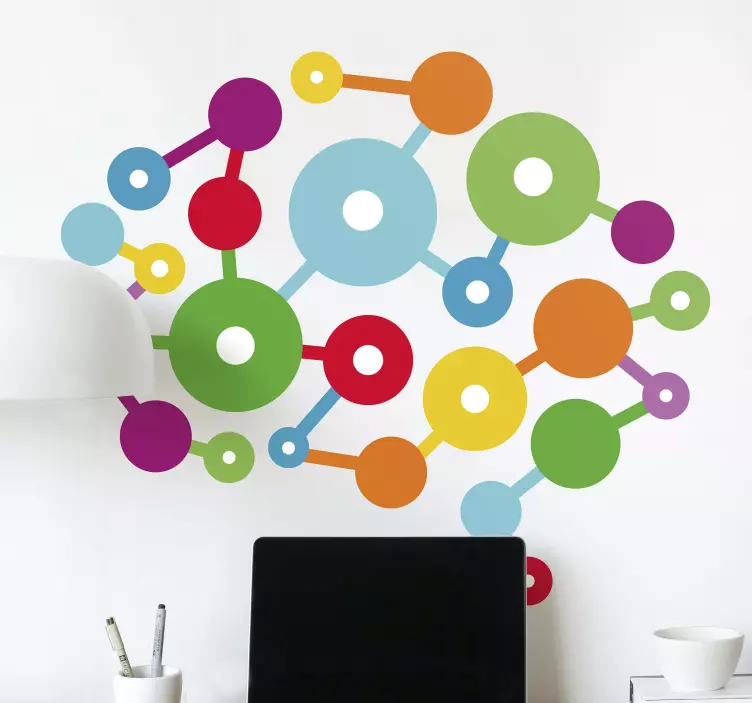 El vinilo geométrico enlaces circulares coloridos presenta un diseño que combina lo cerebral y lo abstracto, creando un efecto geométrico que evoca la conexión entre neuronas. Su estética moderna y vistosa, llena de patrones creativos, transforma cualquier espacio en un lugar lleno de inspiración y originalidad.
