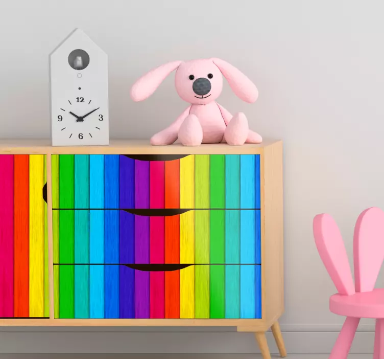 El vinilo geométrico líneas verticales vibrantes presenta un diseño cautivador que combina el efecto de madera con un vibrante arcoíris de rayas y patrones abstractos. Con un estilo que evoca la belleza de los tablones en un entorno multicolor, este producto es ideal para transformar cualquier mueble en una pieza única y llena de vida. ¡Perfecto para quienes buscan dar un toque alegre y moderno a su decoración!