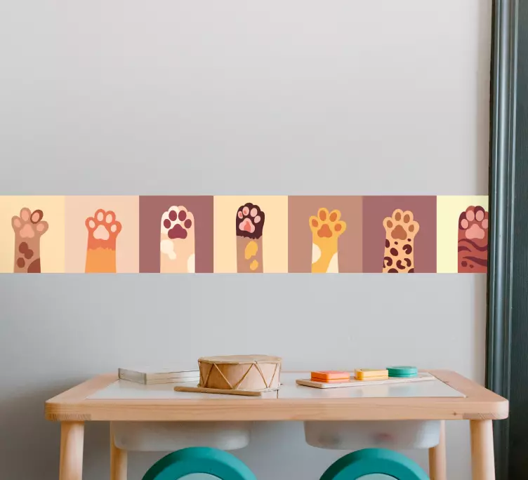 El vinilo huellas alegres de patas es una deliciosa explosión de color y diversión, donde los dibujos animados de patas de animales como gatos se entrelazan en un patrón vistoso que resulta encantador. Este diseño, con su atractiva cenefa y frontera, transforma cualquier espacio en un refugio alegre para tus mascotas y para todos los amantes de los animales. Con un toque de encanto, este azulejo o azulejos decorativos aportan un aire festivo y acogedor a tu hogar.