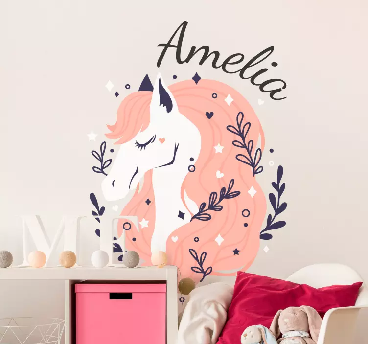 Referencia: A46837Con un encantador unicornio de melena ondulante y delicados acentos florales, este diseño añade un toque caprichoso al espacio de un niño. Personalizable para mayor individualidad, captura un sentido de magia y calidez, lo que lo hace ideal para guarderías o salas de juegos.