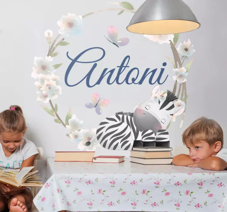 Descubre la magia de nuestro vinilo infantil para pared diseño floral de cebra que transforma cualquier habitación en un espacio alegre y lleno de vida. Este diseño es personalizable, permitiéndote añadir el nombre de tu pequeño en una caligrafía encantadora, rodeado de una guirnalda juguetona. Con la simpática figura de una cebra y hermosas flores, este vinilo es perfecto para estimular la imaginación de los niños y aportar un toque caprichoso a la decoración. ¡Haz que el cuarto de tu hijo sea un lugar especial y lleno de alegría!