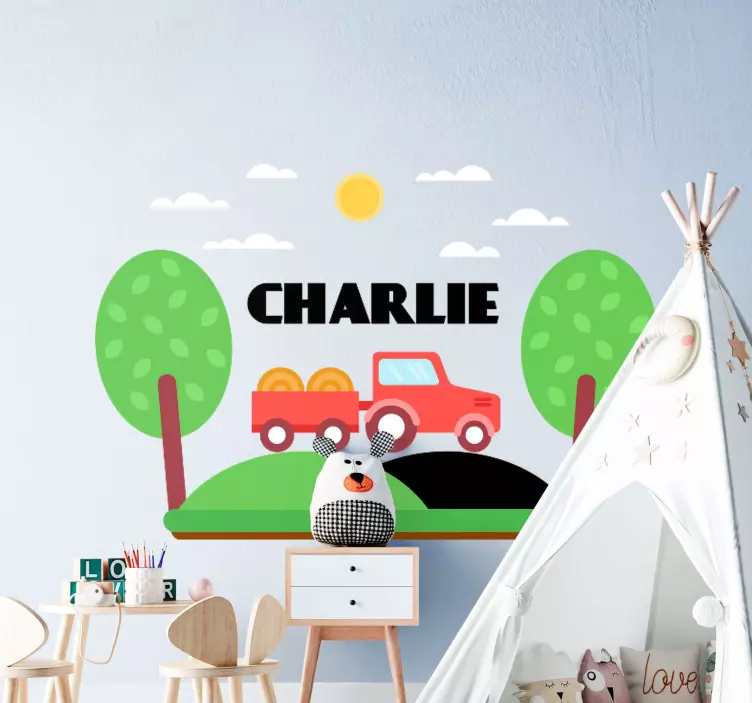 Transforma la habitación de tus pequeños con nuestro vinilo infantil para pared escena de camiones personalizados. Este diseño cautivador presenta un vibrante tractor en medio de una granja, rodeado de árboles, verdor y un brillante sol, creando un ambiente alegre y lleno de vida. Ideal para los niños que sueñan con aventuras en sus camiones de juguete, este vinilo es la pieza perfecta para estimular su imaginación y amor por la naturaleza.