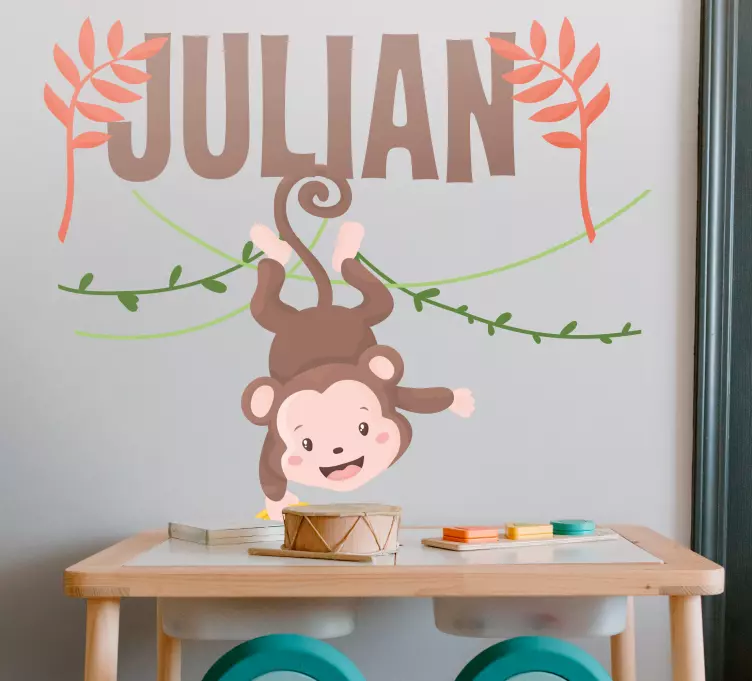 Descubre la magia del vinilo infantil para pared mono lindo colgante, un diseño encantador que presenta un tierno mono colgando de una rama. Este juguetón diseño, lleno de colores vibrantes y estilo de dibujos animados, hará las delicias de los más pequeños. Además, incluye la opción de personalizar el nombre de tu hijo, convirtiéndolo en una pieza única y especial para su habitación.
