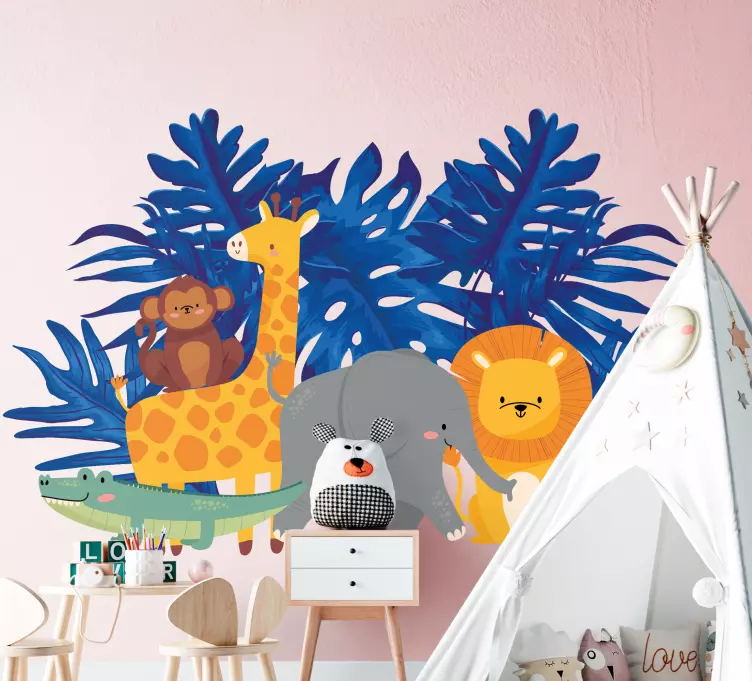 Referencia: A48454Una escena vibrante de la jungla que presenta una divertida variedad de animales, incluyendo una jirafa, un león, un elefante y un mono entre la exuberante vegetación. Este encantador diseño captura la esencia de la aventura y la amistad, haciéndolo ideal para los espacios infantiles, inspirando creatividad e imaginación.