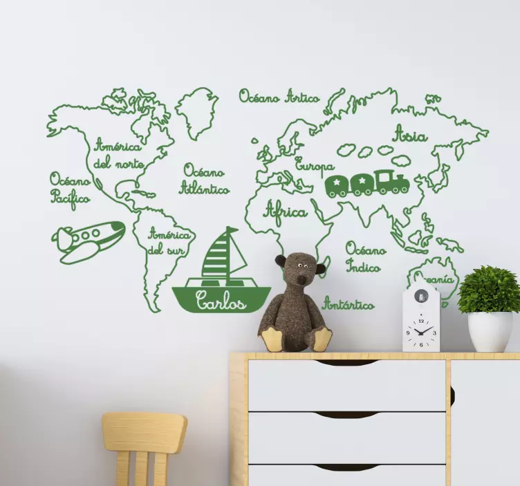 Referencia: A18085Decora la habitación de tu hijo con nuestro Vinilo Mapamundi Infantil con Barca y Nombre