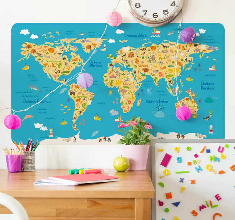 Este vinilo mapa del mundo es encantador y será apreciado por cualquier niño en su espacio. El diseño muestra un mapa del mundo con diferentes animales ubicados en su continente correspondiente. Este vinilo mapamundi infantil está hecho con material de alta calidad, lo que lo hace muy fácil de aplicar. Puedes elegir entre los diferentes tamaños que ofrecemos o personalizarlo a tu gusto. Además, añade una espátula para aplicarlo a la perfección. ¡No te pierdas la oportunidad de hacer feliz a tu hijo con este hermoso vinilo de pared!