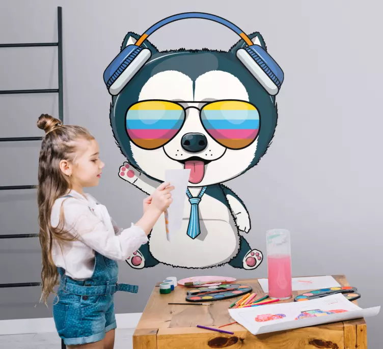 ¡Descubre el encantador Vinilo mascota personaje divertido de mascota! Este diseño cautivador presenta un perro cachorro usando gafas de sol y auriculares, dándole un toque de dibujos animados que lo hace lindo y divertido. Con un estilo vistoso y musical, este animal juguetón es perfecto para alegrar cualquier espacio.