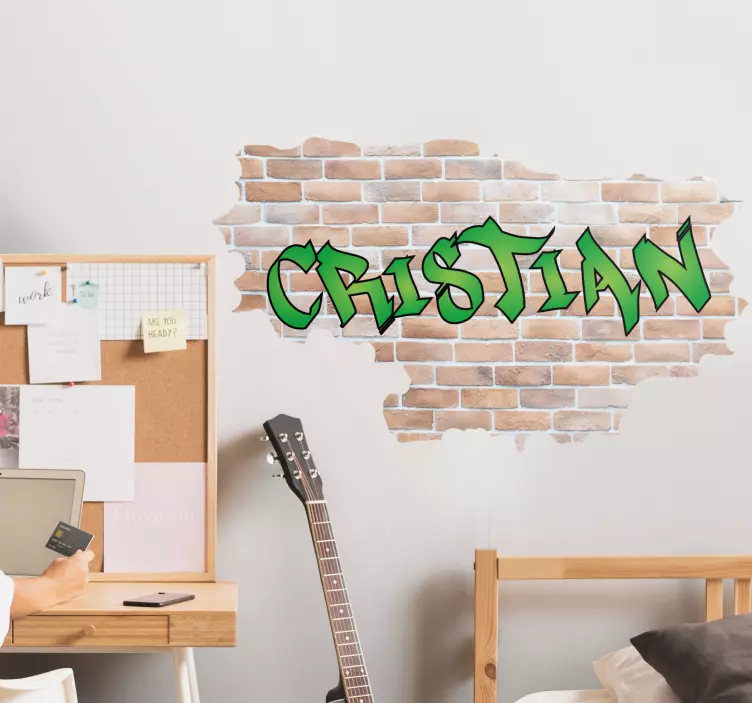 Transforma tu espacio con nuestro vinilo muro urbano personalizado, un diseño que evoca la esencia del arte urbano. Con una representación gráfica de paredes de ladrillo adornadas con graffiti vibrante, este producto es completamente personalizable para incluir tu nombre o cualquier mensaje que desees. Imagina un fondo de ladrillos en tonos verdes, donde cada trazo de graffity cuenta una historia única, convirtiendo cualquier habitación en una galería de arte contemporáneo.