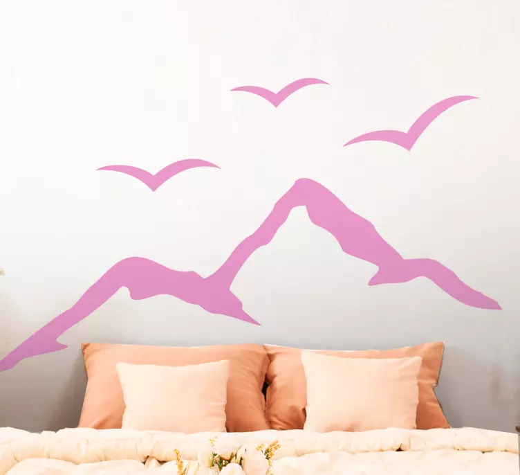 Referencia: A48502La elegante silueta de montañas acompañada de aves en vuelo crea una atmósfera serena. Este diseño resalta la belleza de la naturaleza, ideal para promover la tranquilidad en los espacios habitables. El estilo minimalista asegura que complemente diversos temas de decoración.