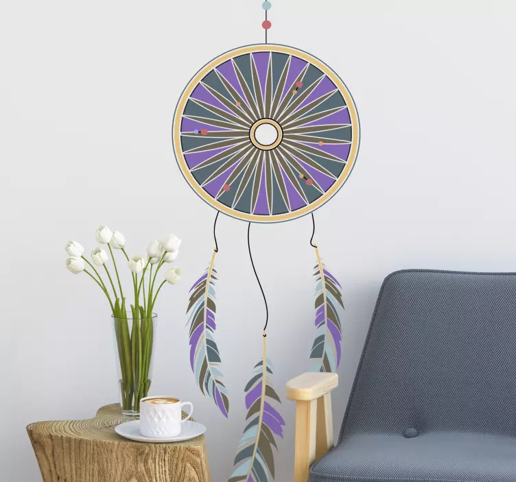 Descubre la magia de nuestro vinilo ornamental atrapasueños concepto, una impresionante ilustración que combina tonos púrpura, lila y morados. Este diseño bohemio y geométrico, adornado con plumas vistosas, transforma cualquier espacio en un refugio de sueños y creatividad. ¡Una pieza única que hará que tus paredes cuenten una historia!