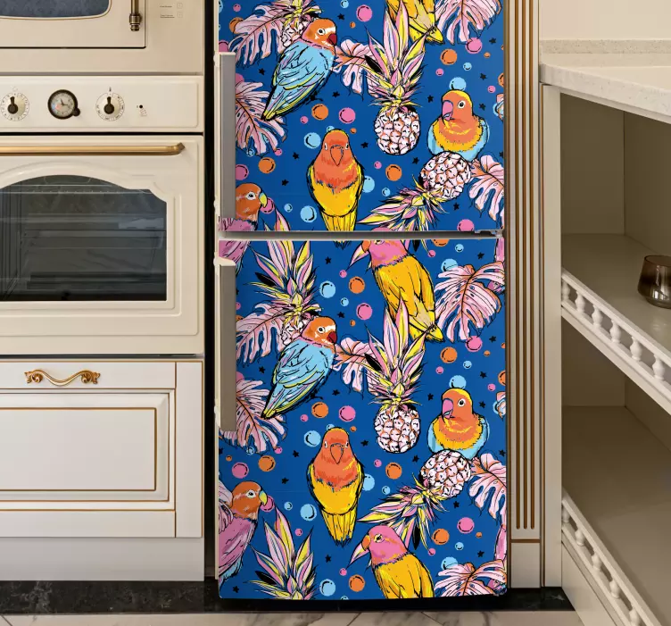 Vinilo para heladera diseño de loros coloridos