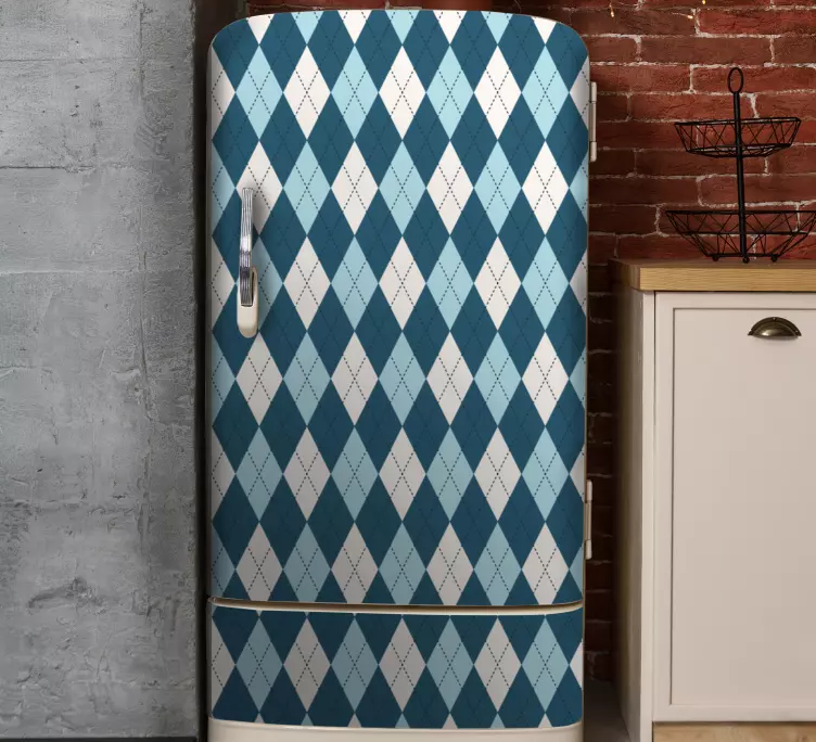 Descubre nuestro vinilo para heladera diseño de rombos, una pieza única que transforma tu refrigerador en un auténtico objeto de arte. Con un elegante patrón de rombos y diamantes en tonos azules, este estampado geométrico aporta un toque moderno y sofisticado a tu nevera. ¡Haz que tu cocina brille con estilo!