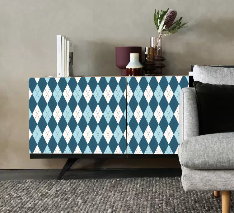 Transforma tu espacio con nuestro Vinilo para mueble configuración en forma de diamante, un diseño gráfico que combina rombos y diamantes en un patrón geométrico cautivador. Este estampado en tonos azul añade un toque decorativo y moderno a cualquier mueble, haciendo que tu hogar luzca más vibrante y lleno de estilo.