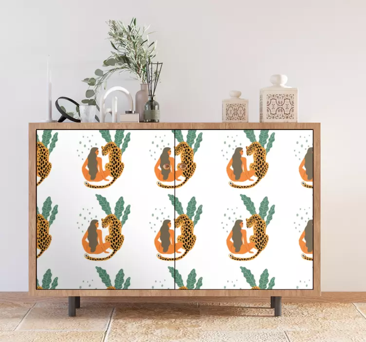 Descubre la belleza del vinilo para mueble escena de planta leopardo, un diseño vibrante que combina la elegancia de una mujer con la majestuosa presencia de leopardos. Este patrón, dibujado a mano, se complementa con exuberantes plantas y un toque caprichoso que evoca la naturaleza tropical. Perfecto para quienes aman el motivo animal y buscan darle vida a sus muebles con un estilo único y original.