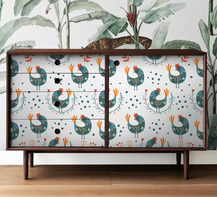 Descubre la magia de la decoración con nuestro Vinilo para mueble ilustración de gallo alegre. Este diseño vibrante presenta pollos y animales de granja en un patrón colorido y estampado floral que alegra cualquier espacio. Su ilustración juguetona y divertida transformará tu mueble en una obra de arte, aportando un toque fresco y alegre a tu hogar.