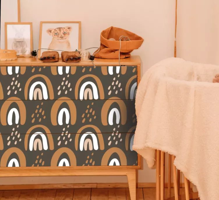 Transforma tus muebles con el Vinilo para mueble patrones arcos coloridos, un diseño que captura la esencia de un arcoiris vibrante acompañado de gotas de lluvia, todo en un patrón geométrico y texturizado. Este estampado vistoso, moderno y juguetón es perfecto para dar un toque fresco y alegre a cualquier espacio, haciendo que tus muebles cobren vida de una manera única y encantadora.