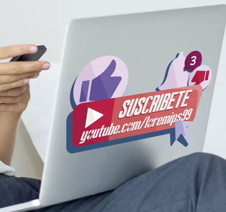 Fantástico vinilo adhesivo personalizable ideal para decorar tu portátil de una manera muy original y útil. El siguiente vinilo decorativo de tecnología está formado por el logo de YouTube acompañado de los iconos de "like", "dislike" y la campana de notificaciones. Esta pegatina para pc es totalmente personalizable, ya que se puede escoger tanto el tamaño del adhesivo como el texto que desees que aparezca después de "Suscríbete youtube,com/". Dale un aire diferente a tu dispositivo y coloca este vinilo para pc de gran calidad para llamar la atención de la gente y conseguir aumentar los suscriptores en tu canal.