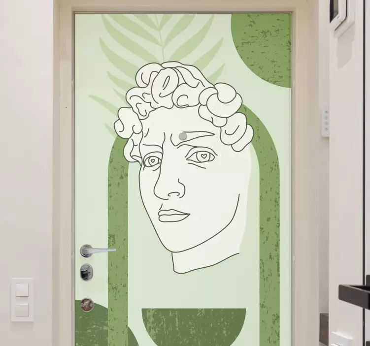 Descubre el vinilo para puerta arte de rostro contemporáneo, una pieza única que transforma cualquier espacio con su diseño gráfico cautivador. Este adhesivo presenta una escultura minimalista que evoca la famosa estatua de David, combinando arte lineal y formas abstractas en tonos verdes que aportan un aire moderno y sofisticado. Ideal para aquellos que aprecian el arte en su vida diaria, este vinilo es la opción perfecta para dar vida a tus puertas.